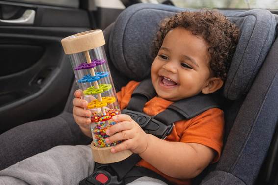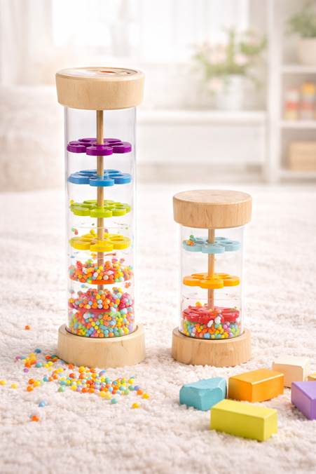 Ao virar o brinquedo, as pequenas bolinhas coloridas descem lentamente pelas hélices internas, criando o som suave da chuva — um estímulo sonoro delicado que tranquiliza e prende a atenção do bebê de forma natural.